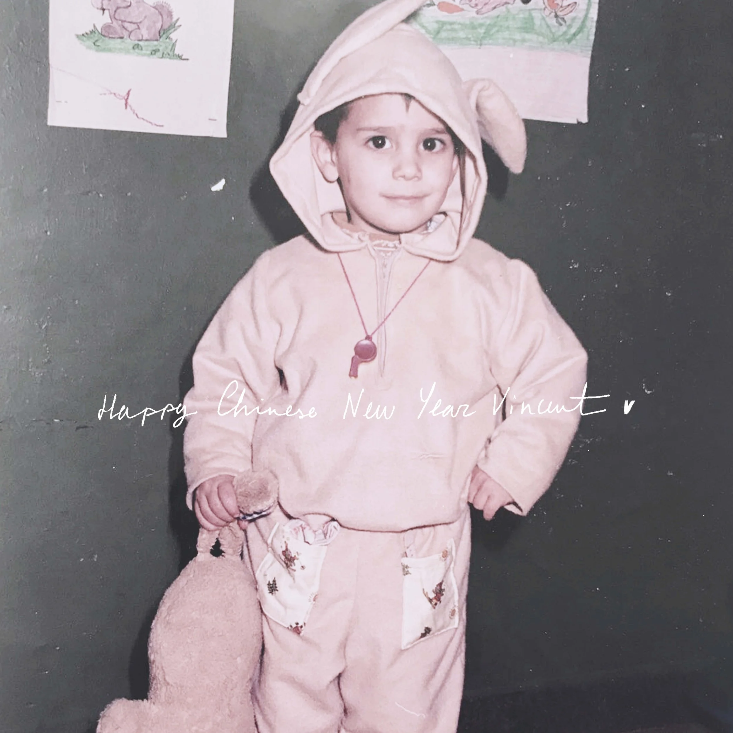 Vaig néixer en 1987, l'any xinès del conill, un conill de foc. Vaig créixer en el carrer conills. La meva família continua vivint en la mateixa casa almenys des de 1890. Quan vaig ser a la guarderia la meva classe era la dels conills i per a carnestoltes la meva mare em va cosir aquesta disfressa, de conill. La meva joguina favorita en aquella classe era un conill de peluix. M'encantava. Mai el deixava anar i mai discutia per ell. Quan un altre nen jugava amb ell jo no plorava. Simplement esperava que ho deixés anar. Quan entrava en la classe l’agafava per les orelles i no les deixava anar fins que m'anava. Tant m'agradava que per a fer la cercavila de carnestoltes pel carrer me'l vaig portar amb mi i, gràcies a això, tinc aquesta foto que m'ho recorda.